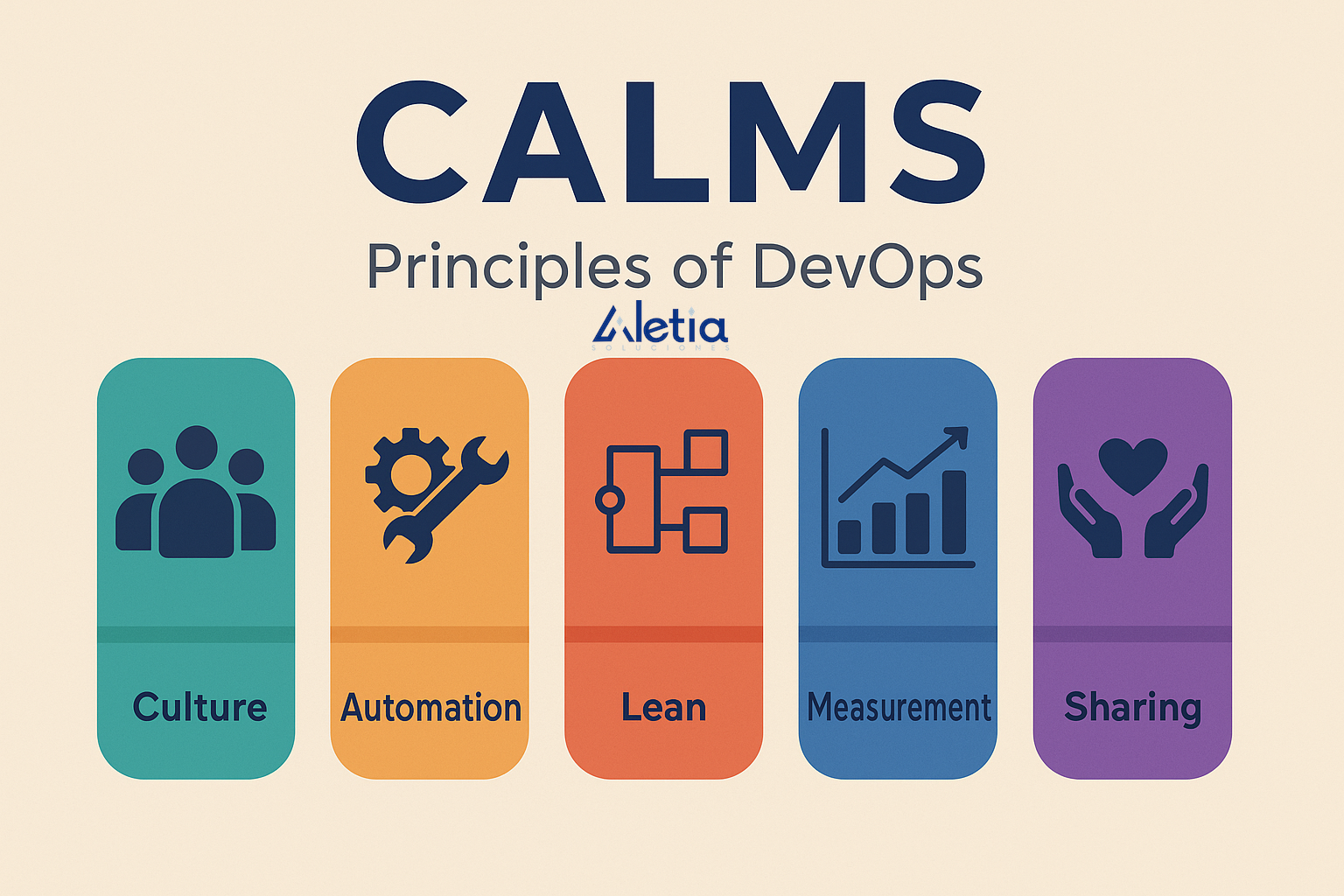 Uno de los marcos más utilizados para describir DevOps es CALMS, que define sus cinco principios fundamentales: